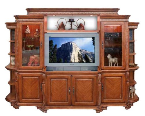 An Extraordinary Collection Inspired by The Grand Style of European Traditional Furniture Brought to The Stately Rooms of Today in a Low Sheen, Subtly Distressed Ash Veneers with Selected Hardwood in a Warm Compton Oak Finish. TV Stand Holds up to 42" wide TV 6 Piece Set TV Stand (9040-1) 46 x 24 x 32H Left Side Unit (9040-2) 24 x 20 x 77H Right Side Unit (9040-3) 24 x 20 x 77H Left Side Curio (9040-4) 20 x 14 x 71H Right Side Curio (9040-5) 20 x 14 x 71H Adjustable Bridge (9040-60) 72 x 21 x 5.5H