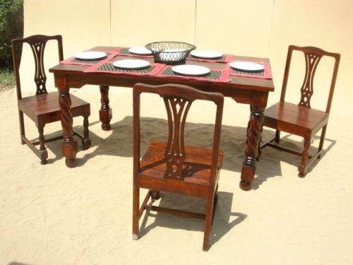 This seven-piece set includes the Table and six matching chairs. All pieces are handmade and uniquely designed for elegance and style. The legs of the table have a beautiful hand carved twisted design that is complimented by the matching chairs. Make dining an event every night with this perfect addition to your home.