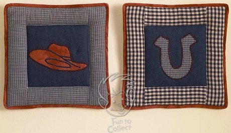 Wild Wild West Soft Wall Hanging Set by NoJo and Bits & Pieces. Includes two soft embroidered applique wall hangings with patchwork stitching. One has a cowboy hat and the other has a horseshoe. Coordinates with other Wild Wild West fashions and accessories. Made of 100% cotton with polyester fill. Each measures 14" x 14".