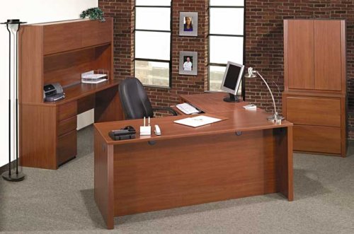 Bestars Prestige III executive office group with its commercial grade melamine laminate finish in beautiful Cinnamon Cherry is perfect for your home or office. This group provides plenty of room for staging work and getting it done. One full pedestal adds storage under the credenza and features a lock, two box drawers and one file drawer for letter or legal documents. All drawers glide open on quality full extension ball-bearing slides. Plenty of storage behind four doors in full length hutch. Oversized keyboard tray has room for keyboard and mouse pad. Multiple grommets for wire management. Desk is fully reversible. Ships ready to assemble. 8-Piece Group includes: BST59-400 Executive Desk BST59-810 Return for Desk BST59-830 Keyboard Shelf/CPU Platform BST59-610 Credenza BST59-520 Hutch for Credenza BST59-620 Full Pedestal BST59-630 Lateral File BST59-510 Two-Door Cabinet