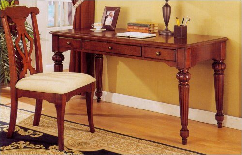 A rich warm brown finish accentuates the spindle fluted legs of our writing desk and chair set. Desk has three slender drawers for small storage. Also use alone for an entry table as well as a desk. Hardware is metal knobs. Chair has a fabric seat. Size of desk is 58 inches x 28 inches. Chair seat is 18 inches, chair size is 40 inches high.Width Depth Height