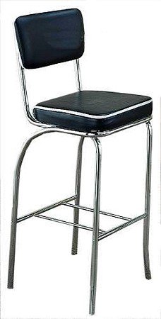 Set of 2 50's Black Retro Nostalgic Style Bar Chairs/Stools This is a brand new in box 50's Retro Nostalgic Style Set of 2 Fountain Bar Chairs/Stools with Chrome Plating and Black Vinyl Covered Cushioned Seat and Back. This item is modeled after the famous style of the American 1950's Diner that has served so many back in the days. The tubular steel frame of the item is plated with chrome and constructed with quality. Its smooth, strong, and durable surfaces makes it easy to clean and hassle free. This item is sold in sets of 2 only, for safety in packaging and shipping. (Requires Simple Assembly) Dimensions Measure: 22 1/2"L x 17 1/2"W x 45"H (29" to the Seat).