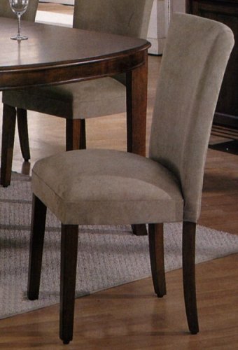 Classic style combines with traditional design to create an updated look for this pair of taupe parson chairs. Beautiful and stylish, this set will be a welcome addition to any decor. Two parson chairs, Materials: Solid wood frame and tuape microfiber suede with an easy to clean covering complete this set. The chairs have square, curved backs, and the seats and backs are fully padded for maximum comfort. Chairs measure 19 inches long x 23 1/2 inches wide x 38 inches high. Lowest factory direct price guarantee.