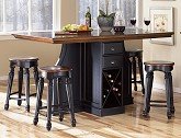 Wine Country. Our uniquely styled and versatile Vineyards collection will bring to mind the casually elegant atmosphere of a wine-tasting weekend retreat. The lovely combination of the black and cherry finishes add visual interest while functional details like built-in bottle storage and four storage drawers make this one of our most exciting style choices! Five piece set includes the handsome table and four matching counter-height stools, as shown.