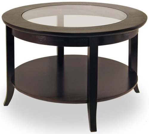 Elegantly design with glass top, this coffee table. Its flared leg, shelf blends well with any style of room decor.Espresso Finish. 30"(W) x 30"(D) x 18"(H)