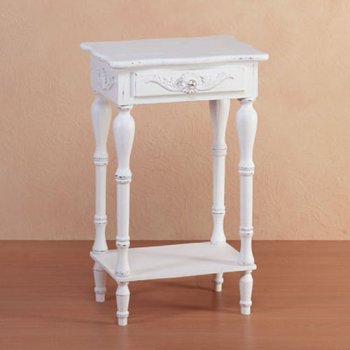 Perfect for living room or hall, this shabby chic side table includes a handy drawer and bottom shelf. Wood with distressed white finish. This distressed style side table measures 17 3/4" x 13" x 28" high.