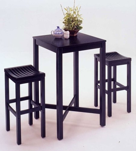 This furniture arrives unassembled. Features: Solid hardwood construction with Black Veneer Table Top and Black finish Stools have curved shaped seat for comfort Easy to Assemble Finish: Black Dimensions: Table: 26 3/4"(W) x 26 3/4"(D) x 42"(H) Stool: 15 3/4"(W) x 13 3/4"(D) x 29"(H)