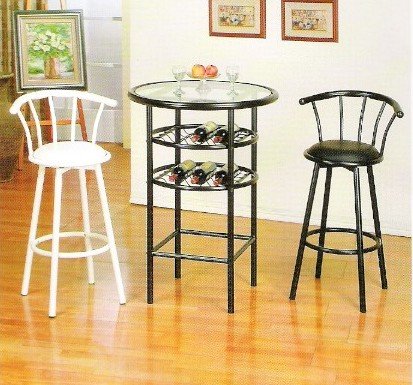 3 pc Black finish metal bar table set with wine rack and round glass top , black or white chairs available. Some assembly required. Table measures 30" Dia , chairs 29" H at seat.